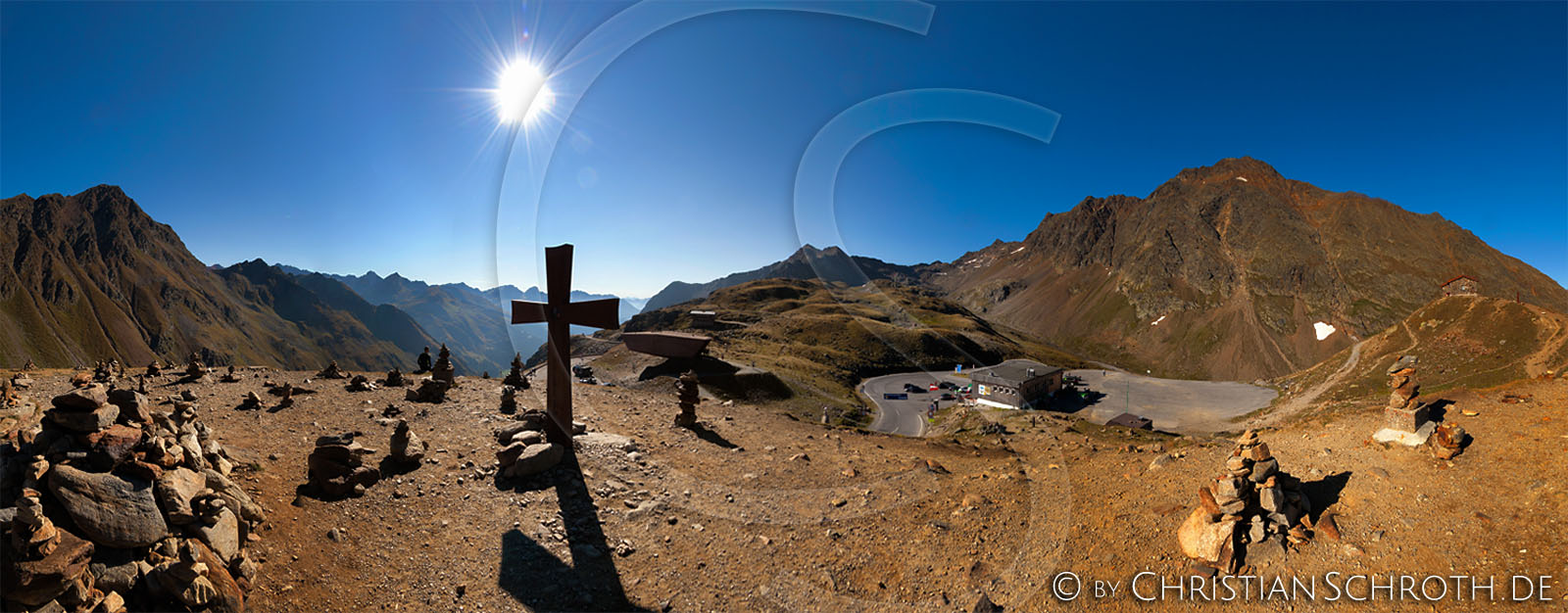 360 Grad Panorama auf der Passhöhe des Timmelsjoch mit Gipfelkreuz crosspoint timmelsjoch