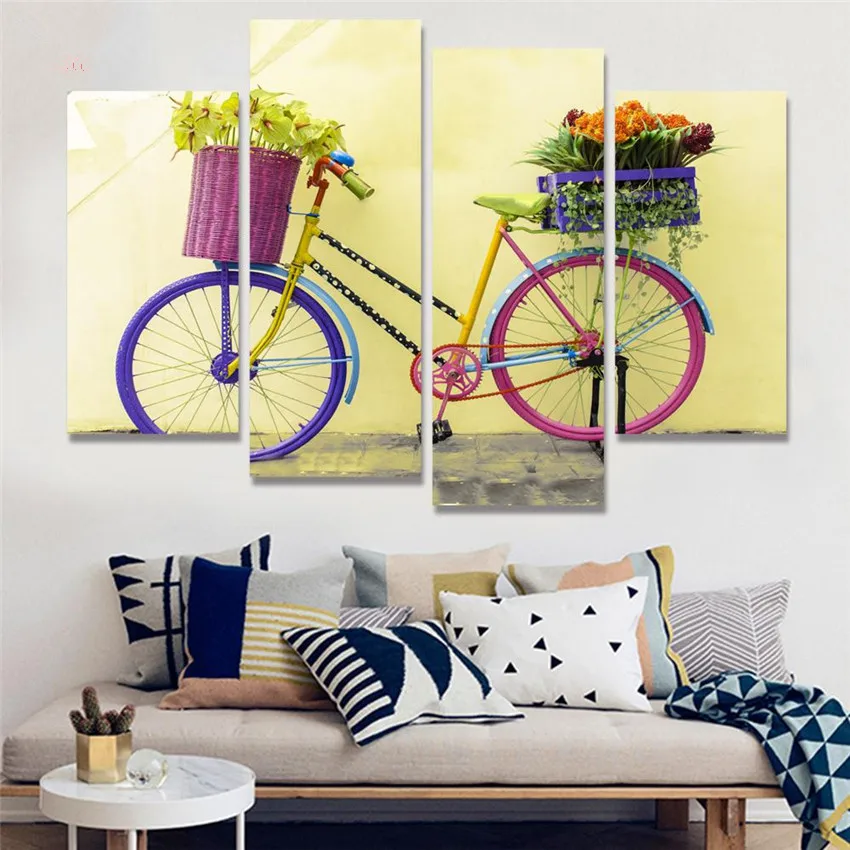 4 Panels canvas paintings of bicycle bike flower basket Wall Pictures poster printer canvas wall bicycle canvas wall art